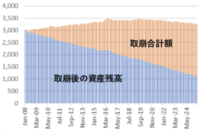 取崩し合計額と取崩後資産残高の合計が元本の3000万円まで回復し、